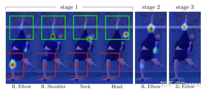 下面这张图给出了一个具体的例子来强调spatial context的重要性,也展现了refinement的过程。在stage1时,错误的将right elbow定位到了right knee处;在stage2时,由于有了stage1提供的spatial context信息,我们根据right shoulder的位置能够对right elbow的位置进行纠正,从图中可以看到响应的峰值已经基本到了正确位置。在stage3时,stage2中一些错误的响应(left elbow、right knee)彻底被消除,right elbow的定位也更加精确。