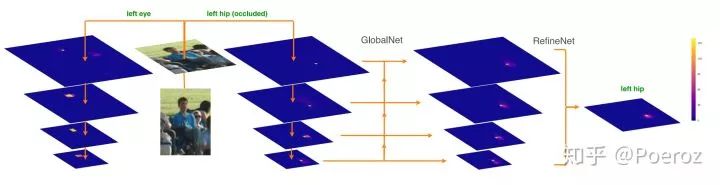 下面这张图给出了一个例子(绿点表示ground truth),对于eye来说较容易定位,通过GlobalNet即可定位到。而对于hip来说,在原图中被遮挡,仅仅使用GlobalNet难以直接精确定位。通过RefineNet将语境信息整合进来,才使得这些关键点被定位。