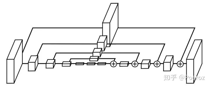 每个Hourglass module的结构如下图所示,其中每个box都是一个残差结构。可以看到在top-down阶段,对于两个相邻分辨率的feature map,我们通过upsampling(这里用的是nearest neighbor upsampling)对较低分辨率的feature map进行上采样,然后通过skip connection将bottom-up阶段较高分辨率的feature map拿过来,此时再通过element-wise addition将这两部分特征进行合并。通过这种方式,在top-down阶段将不同分辨率下的特征逐步进行了融合。