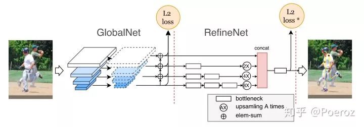 CPN,Cascaded Pyramid Network,是2017年旷视提出的一种网络结构,获得了COCO 2017 Keypoint Benchmark的冠军,网络结构如下图所示。这个网络可以分为两部分:GlobalNet和RefineNet,从名字也可以看出后半部分网络是在前半部分的基础上做refinement。GlobalNet的作用主要是对关键点进行一个初步的检测,由于使用了强大的ResNet作为backbone,网络能够提取到较为丰富的特征(在此之前的CPM、Hourglass都没有使用,因此网络的特征提取能力较差),并且使用了FPN结构加强了特征提取,在这个过程中像head、eyes这些简单且可见的关键点基本能够被有效地定位。而对于GlobalNet没有检测到的关键点,使用RefineNet进行进一步的挖掘,RefineNet实际上是将pyramid结构中不同分辨率下的特征进行了一个整合,这样一些被遮挡的、难以定位的关键点,根据融合后的上下文语境信息能够更好的被定位到。