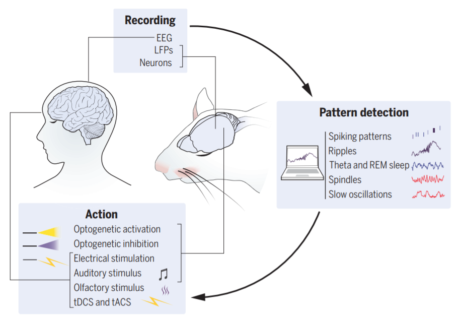 在研究方法上,研究人员通过闭环实验对大脑信号进行实时处理,检测睡眠模式,同时使用能够实时影响神经网络的介入方法,自动触发给定模式的检测,以检验某个操作是「促进」还是「损害」记忆巩固。