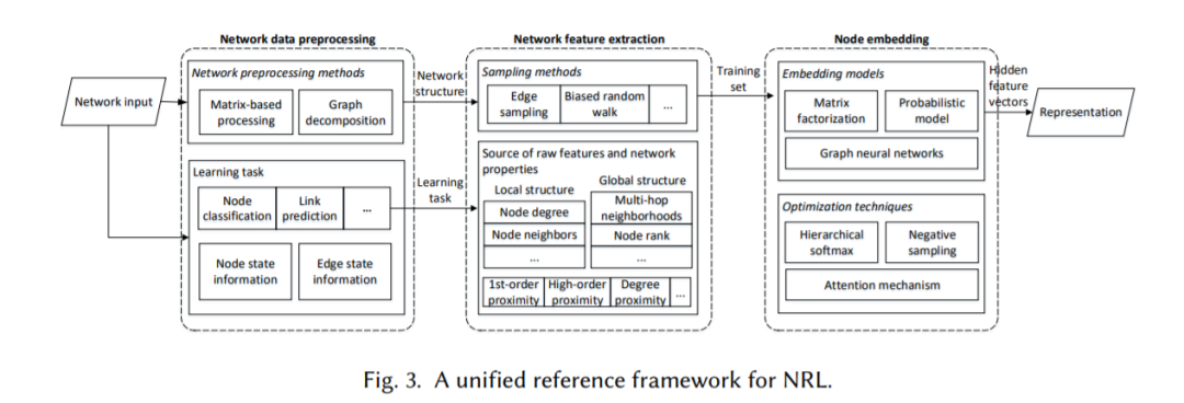 目前的综述[13,20,40]主要集中在提出一个分类来回顾网络表示学习的现有工作。[13]分别提出了基于问题设置和技术的图嵌入两种分类法,于2017年首次在ArXiv上出现,并于2018年发表。[20]根据保留的信息类型提出了网络嵌入的分类。[40]于2017年出现在IEEE Data Eng杂志上。本文介绍了一套传统的节点嵌入方法,重点介绍了基于成对邻近的方法和基于邻域聚合的方法。相比之下,我们统一的参考框架提供了一个更广泛、更全面的网络表示学习现状的比较综述。在我们的三个阶段的参考框架中,每个阶段都是一组专门用于这一阶段的任务的技术解决方案的分类。例如,我们不仅回顾了使用统一框架的节点嵌入模型,还描述了一组在不同的节点嵌入方法中常用的优化技术,并概述了NRL的最新进展。