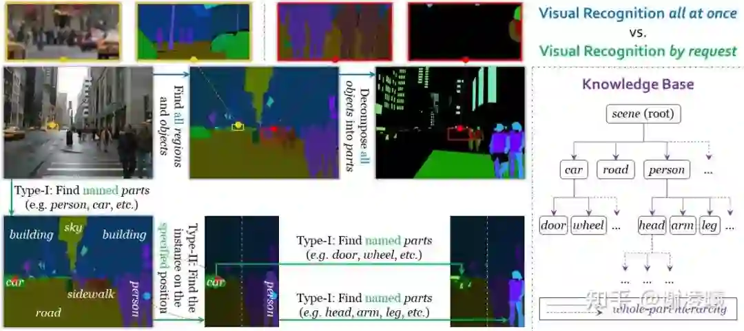 在这三个条件的牵引下,我们设计出了按需视觉识别任务。与传统意义上的统一视觉识别不同,按需视觉识别以request为单位进行标注、学习和评测。当前,系统支持两类request,分别实现了从instance到semantic的分割、以及从semantic到instance的分割,因而两者结合起来,就能够实现任意精细程度的图像分割。按需视觉识别的另一个好处在于,在完成任意数量的request之后停止下来,都不会影响标注的精确性(即使大量信息没有被标注出来),这对于开放域的可扩展性(如新增语义类别)有很大的好处。具体细节,可以参看按需视觉识别的文章(链接见上文)。