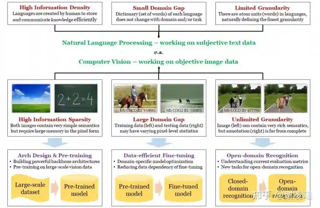 从根本上说,自然语言是人类创造出来,用于存储知识和交流信息的载体,所以必然具有高效和信息密度高的特性;而图像则是人类通过各种传感器捕捉的光学信号,它能够客观地反映真实情况,但相应地就不具有强语义,且信息密度可能很低。