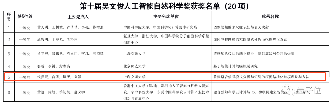 而在人工智能自然科学奖的5个一等奖中,唯一一项语音相关的奖项,花落上海交通大学。这也是语音领域的研究成果第一次获得吴文俊人工智能科学技术奖的一等奖。