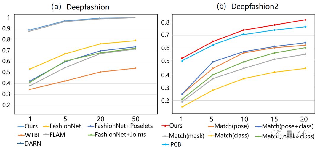 在同款服装检索实验中,他们选用了FashionNet, Match-RCNN, PCB等方法作为对比,在Deepfashion和Deepfashion2上分别进行了实验。
