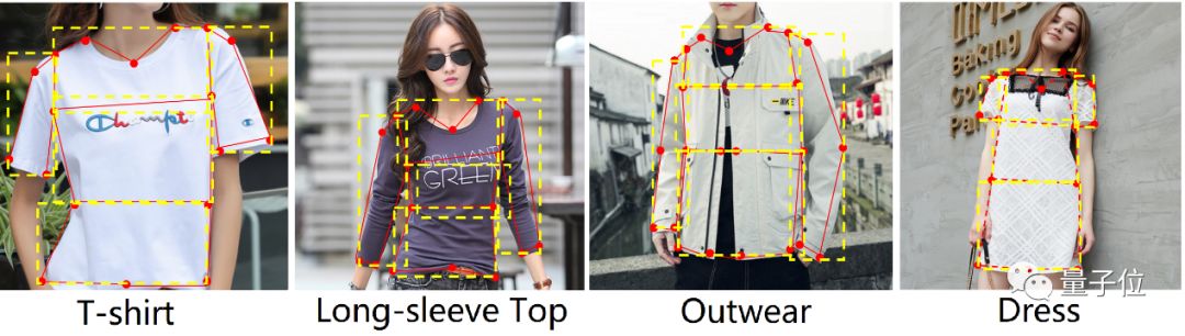 阿里的研究人员将图像中的服装分为五个区域,包括领子、胸部、腰部和两个袖子区域,并在四类服装(短袖T恤、长袖上衣、外套、连衣裙)上实验,各服装区域划分如下图所示: