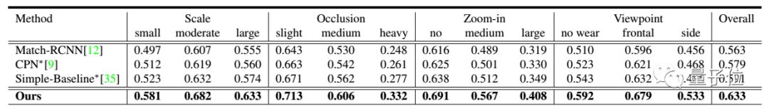 在服装关键点估计部分,阿里研究人员在目前复杂度最高的Deepfashion2数据集上进行了评测,与现有Match-RCNN, CPN, Simple-Baseline等方法相比,服装关键点估计模型在各个子集上都取得了最高的mAP结果: