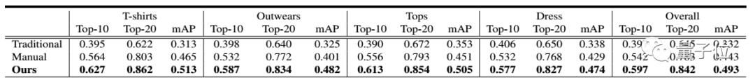 从表中结果可以看出,论文所用方法在各个服装类别都取得了最佳效果。