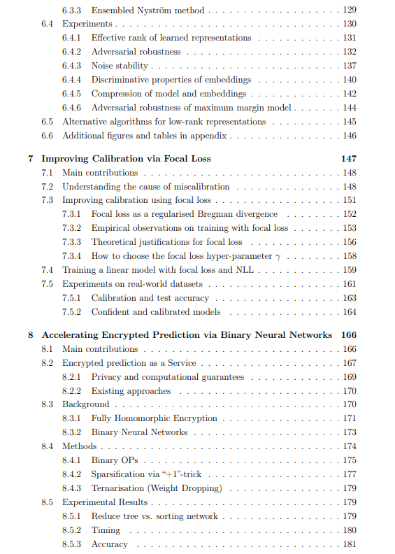 最近,深度学习研究在包括计算机视觉、自然语言处理和强化学习在内的广泛任务中取得了令人印象深刻的快速进展。这些系统的非凡性能常常给人一种印象,即它们可以用来使我们的生活变得更好。然而,正如最近的研究指出的,这些系统存在一些问题,使其在现实世界中使用不可靠,包括易受对抗性攻击(Szegedy等人[243]),倾向于记忆噪声(Zhang等人[286]),对错误的预测(错误校准)过于自信(Guo等人[99]),以及不适合处理私人数据(Gilad-Bachrach等人[88])。在本分析中,我们将详细研究这些问题,研究它们的原因,并提出在实践中减少它们的计算成本低廉的算法。为此,我们确定了深度神经网络中的结构,可以利用这些结构来减轻上述导致深度学习算法不可靠的原因。在第4章中,我们展示了最小化神经网络中单个权重矩阵的矩阵的一个属性,称为稳定秩,降低了网络记忆噪声的趋势,而不牺牲其在无噪声数据上的性能。在第5章中,我们证明了记忆标签噪声或进行不适当的表示学习使实现对抗鲁棒性成为不可能。第6章表明,神经网络表示空间上的低秩先验增加了神经网络对对抗性扰动的鲁棒性,而在实践中不会导致与精度的任何权衡。在第7章中,我们重点介绍焦点损失(focal loss)的使用,它根据神经网络对每个样本的分类情况,对单个样本的损失分量进行差异加权,作为交叉熵的替代损失函数,以最小化神经网络中的错误校准。在第8章中,我们首先定义了一个名为加密预测即服务(Encrypted Prediction As a Service, EPAAS)的新框架,以及一系列计算和隐私约束。然后,我们提出使用一种完全同态加密[84]方案,该方案可与二元神经网络[61]一起使用,以及一组代数和计算技巧,以满足我们对EPAAS的所有条件,同时计算效率高。