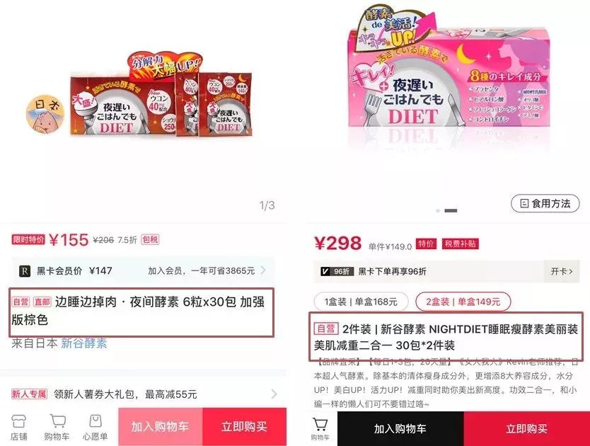本文开篇对比案例中,左边夜间酵素的商品文案是来自小红书,右边这款夜间酵素的商品包装是来自网易考拉商城。不得不说,以社区起家的跨境电商平台小红书,在文案包装确实深谙用户需求。