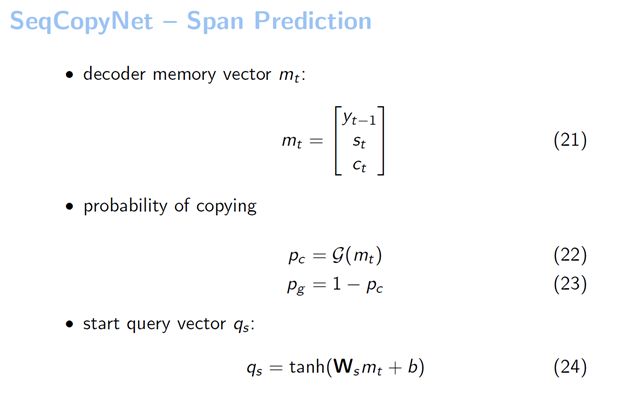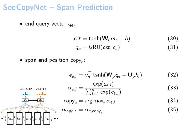 有了qs之后,我们直接把它作为一个pointer network的输入。在整个句子中做了一个Attention,可以看到COPYs是取概率最大的位置。从这个图例中我们看到系统用qs在输入当中进行了一个Attention,最大的位置我们假设是12,它就选择出来COPY的起始位置是12。