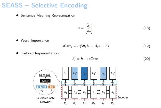 我们提出的这个模型叫“选择性编码模型”,它对输入句子中的每个词都会进行建模,这个建模的方法是基于一个已经编码好的句子,我们利用这个句子的信息来判断句中的词是否重要,由此来构建一个输入句子中词的新的表示。我们把这样一个选择的过程称之为选择性编码,而这个模型就叫做“选择性编码模型”。