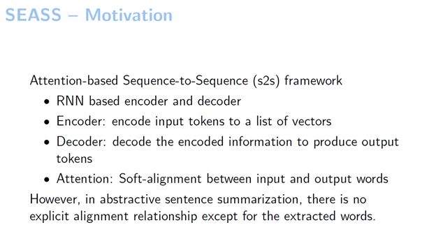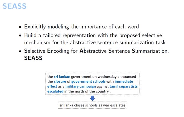 首先介绍一下我们如何从编码器端改进生成式句子摘要。这是我们2017年在ACL上的一个工作,今天介绍的工作也都是我在微软亚洲研究院实习期间完成的。