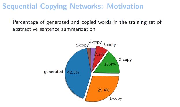 我们推测在生成句子摘要的时候拷贝的地方会比较多。然后想在数据集上统计一下这个推测是否是正确的,所以就在Gigaword这个训练集上统计了一下生成词和拷贝词的百分比。可以看到生成的词占了42.5%,剩下的词全都是拷贝出来的。我们还分别统计了拷贝一个词、拷贝两个词和拷贝三个词的情况。可以看到,拷贝两个词以上的拷贝大概能占到三分之一。这其实也验证了我们的观点,序列拷贝在很多任务中都是存在的。
