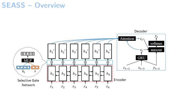 首先,我们看一下这个模型的框架,它还是一个基于序列到序列的模型。区别在于我们提出了选择性门网络,它选择输入句子当中哪一部分是重要的。例如我们的模型示例图中画了6个词。读了一遍句子之后,我们可以感觉到这个句子中的哪些词比较重要,然后就由这个网络来判定句子中哪些词比较重要,由此我们对这6个词分别构建出来一个新的表示。接下来我们使用了一个解码器,但不是基于它原始的表示,而是基于我们新构建的这一层表示来进行解码的。