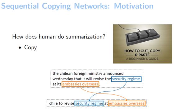 人在做句子摘要的时候会先读句子,然后选重点词,然后把它写下来。人在写的时候是怎么样写的呢?其实可以用一个记号笔把重要的部分直接copy过来。我们给了一个在Gigaword这个数据集上找的例子,可以看到它拷贝的部分是比较多的,比如说把“安全机制”、“海外大使馆”两个词都拷贝了过来。