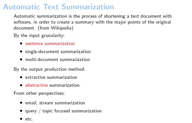 文本自动摘要可以分成不同的种类。按照输入文本的类别来分,输入最短的是句子摘要,输入稍微长一点的是单文档级的摘要,在单文档级别摘要之上还有多文档的摘要。