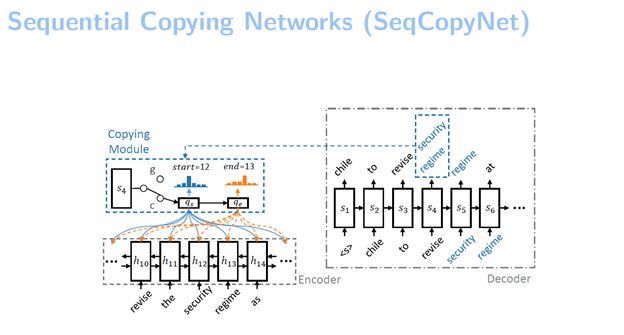 第二,我们做了一个pointer network,我们用这个pointer network来选择要拷贝的这个词组的起始位置和结束位置。