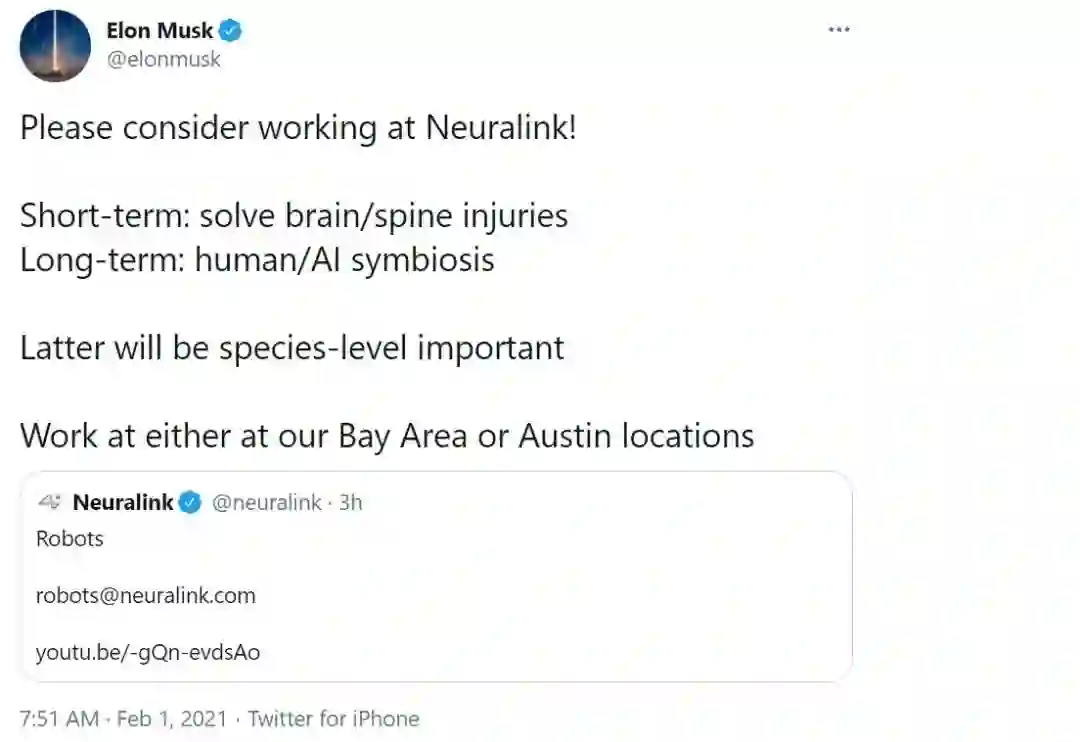 2 月 1 日,Neuralink 在推特上发布了一段视频,重点介绍了这款手术机器人的发展历程以及未来应用前景。伊隆 · 马斯克也转推,指明了 Neuralink 的短期(解决大脑和脊柱损失)以及长期(人体和 AI 共生)发展愿景,呼吁「有志之士」加入进来。