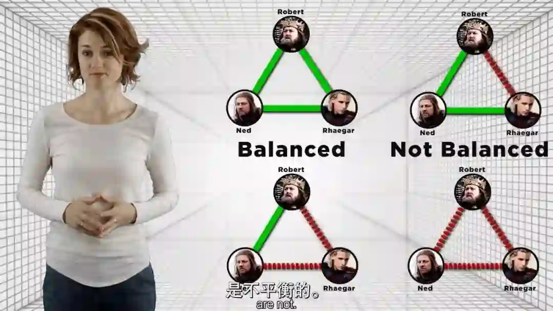 如果两个人物之间关系可以分为朋友(红色虚线)和敌人(绿色实线), 当三个人之间是三条绿线或只有一条绿线的时候, 该网络称为是结构平衡的, 否则称为不平衡. 然后通过探索这样的性质就能了解最终全局究竟会达到哪种状态了. 请看下面 [遇见数学] 翻译无限数学的精彩视频: