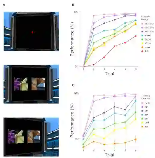 在我们重建的众多实验中,其中一个实验叫做Harlow实验,这是一个20世纪40年代的心理学测试,用于探索元学习的概念。在最初的测试中,对于一组猴子,我们展示两个它们不熟悉的物品供它们选择,只有选择其中某一个时会给予它们食物奖励。这两个物品被展示了六次,每次左右放置的位置都是随机的,所以猴子们必须知道选择哪个物品会给予食物奖励。然后他们被展示了两个全新的物品,再次只有选择其中一个物品会获得食物奖励。在训练过程中,猴子们制定了一种策略来选择奖励关联对象:它们学会了第一次随机选择,之后便基于奖励反馈来选择特定对象,而不是左侧或右侧的位置。实验表明,这些猴子可以内化任务的基本原理,并且学习抽象的规则结构。实际上,这就是学会学习(learning to learn)。