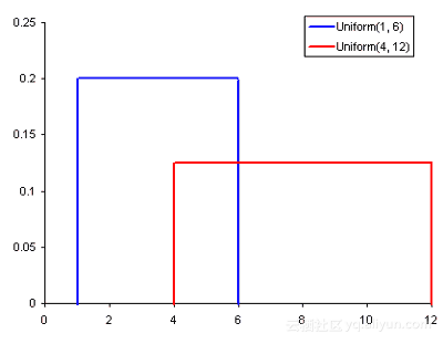均匀分布是其中最基本的概率分布方式。它有一个只出现在一定范围内的值,而在该范围之外的都是0。我们也可以把它考虑为是一个具有两个分类的变量:0或另一个值。分类变量可能具有除0之外的多个值,但我们仍然可以将其可视化为多个均匀分布的分段函数;