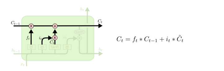 下一步就是决定哪些新的信息需要存储在细胞状态中。这包含两部分:第一部分,一个sigmoid层叫“输入门限层”决定哪些值我们需要去更新。第二部分,一个tanh层,创建一个新的候选向量