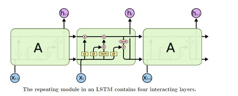 LSTM同样也是这种链式结构,但是重复的模型拥有不同的结构,它与单个的神经网层不同,它有四个, 使用非常特别方式进行交互。