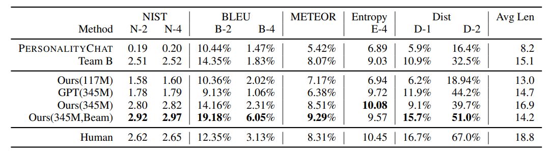 作者将 DialoGPT 与另外两个基准进行了比较:作者自己内部的基于 (Li et al., 2016a) 的序列到序列模型 PersonalityChat,这个模型是基于 Twitter 数据训练的,已经在微软 Azure 的 Cognitive Service 得到了实际应用。表 2 总结了自动化评估的结果。有 345M 个参数的 DialoGPT 以及波束搜索在几乎所有基准上都得到了最高的自动评估分数。