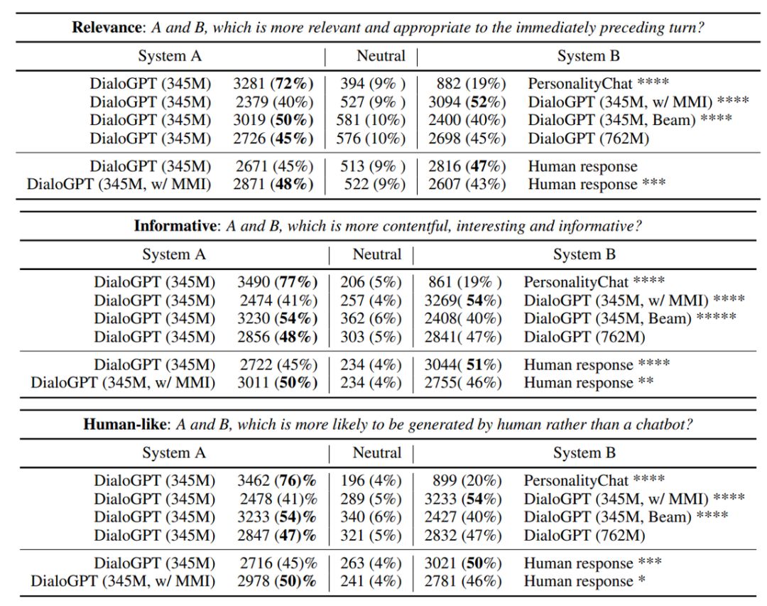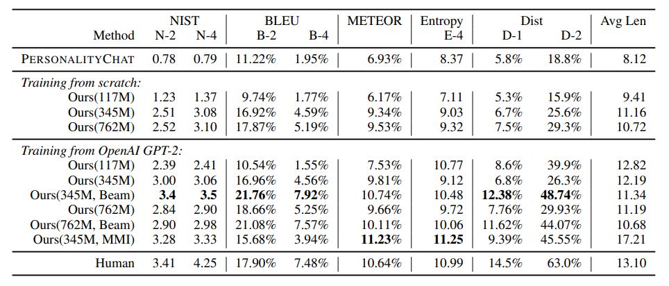 作者进一步在一个有 6K 个样本的多参照测试集上评估了 DialoGPT。结果见表 3。测试过程使用了两种设置:从头开始训练以及使用 GPT-2 作为预训练模型进行微调。在这两种设置中,更大的模型都总是优于更小的模型。另外表 3 的倒数第二行总结了执行互信息最大化的结果。