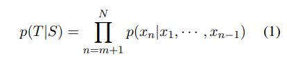 作者首先将一个对话会话中所有对话回合连接成一个长文本 x_1, · · · , x_N(N 为序列长度),并以「文本结束 token」结束。可将源句子(对话历史)记为 S = x_1, · · · , x_m,将目标句子(基本真值响应)记为 T = x_{m+1}, · · · , x_N,则 P(T|S) 的条件分布可以写为一系列条件概率的积: