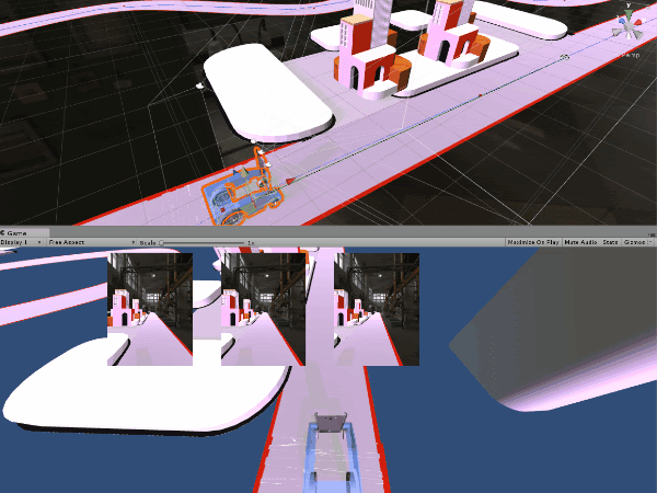 我们开始为车辆设计更复杂的路况,如:在轨道上添加多个路口,更多可选择的路线,我们希望车辆能够应对这些新路况。但是,我们立即遇到了新的问题:当车辆试图在路口处转弯时,由于看到轨道外的随机出现的物体而转向并撞到了侧方轨道。