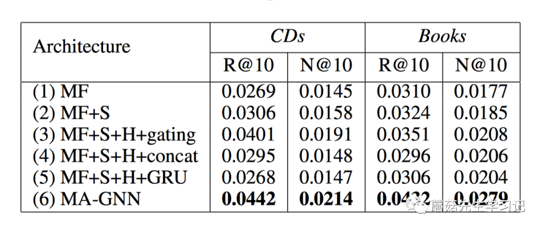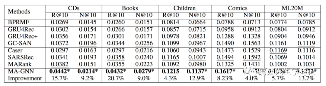 对比实验(方法包括:BPRMF,GRU4Rec,GRU4Rec+,GC-SAN,Caser,SASRec,MARank),居然没有选SR-GNN(个人认为虽然GC-SAN论文中战胜了SR-GNN,但是本人在很多实践中发现SR-GNN比GC-SAN好)。