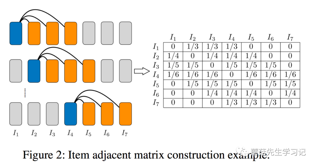 输入是短期序列 ,输出是蕴含在短期序列中用户的兴趣表征 , 是short-term的缩小。如图所示,左下角的部分。作者采用了两层的GNN网络来捕获蕴含在序列中的局部结构信息,并形成用户短期兴趣表征。为了能够用GNN来建模,需要将序列转成session graph。策略是,短期序列中的每个物品和其后面的3个物品做连接,并对形成的邻接矩阵按照行做归一化。如下图所示: