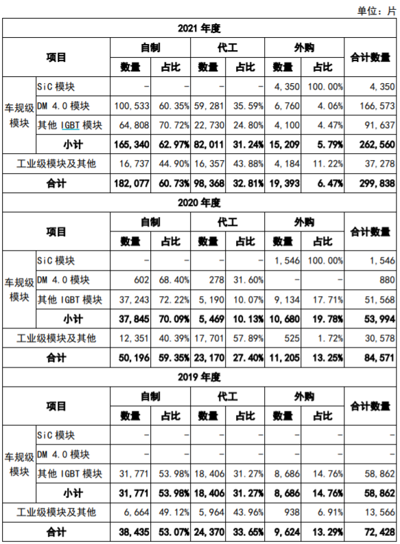 招股书也披露了这方面的数据。2021年,比亚迪半导体车规级功率半导体自给率不到63%,有30%以上仍然需要委外代工,剩下不到6%的部分需要对外采购。这不单单是个别现象,招股书数据显示,2019-2021年,比亚迪半导体有3成功率半导体需要由其他晶圆厂制造。