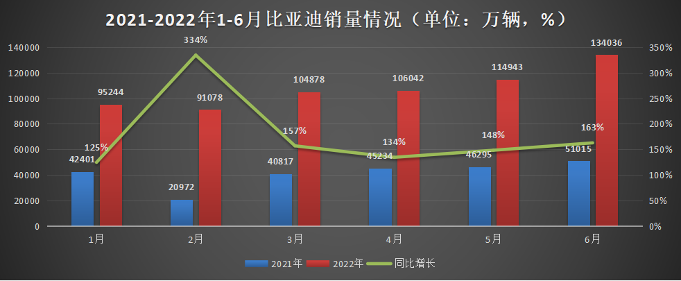 推高的过程中也仍然要在创新上有所侧重,所以飙升最快的就是新能源车。2022年上半年,新能源车销量较去年增长了1.2倍,远远超过了汽车行业整体大约20%的增速。按照6月最新的销量数据,新能源车卖了59.6万辆,这其中有13.4万辆贡献自比亚迪。也就是说,几乎每4辆新能源车就有1辆来自比亚迪。