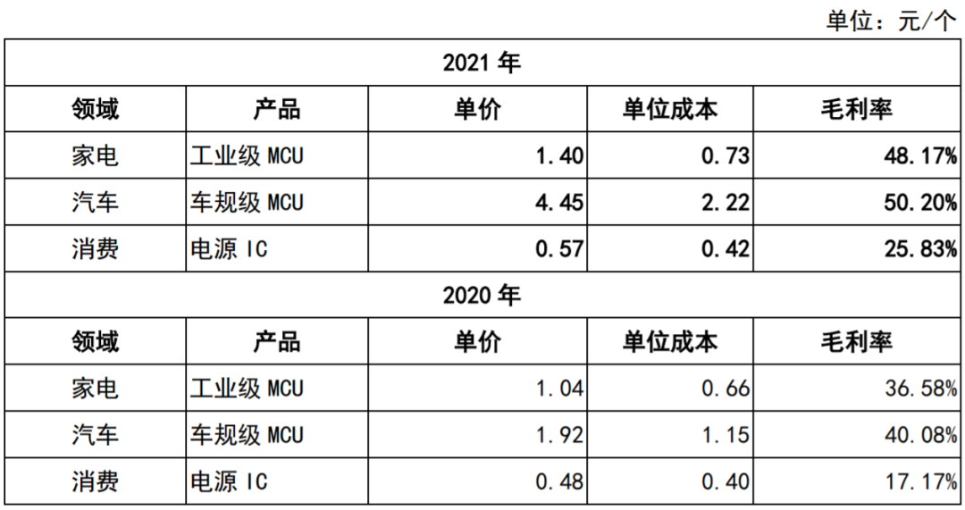 同样按照一个价格涨幅来说,去年车规级MCU单价从1.92元/个增长至4.45元/个,对应毛利率由40.08%增长至50.20%;工业级MCU单价由1.04元/个增长至1.40元/个,对应毛利率由36.58%提升至48.17%。