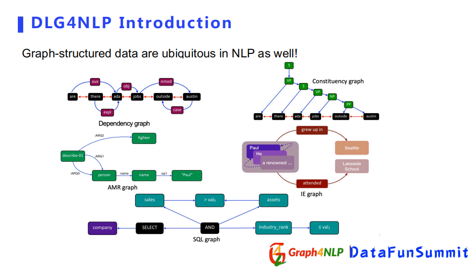 同样在NLP的领域里,我们也会发现很多很多可以表示为图结构的数据。比如针对一个句子,如果我们想表示这个句子里的句法信息的话,可以建立一个dependency graph或者constituency graph;如果我们想捕捉句子的语义信息的话,可以建立一个AMR graph或者IE graph;如果我们把程序语言也看作一种自然语言的话,我们可以构建出捕捉程序逻辑关系的SQL graph。