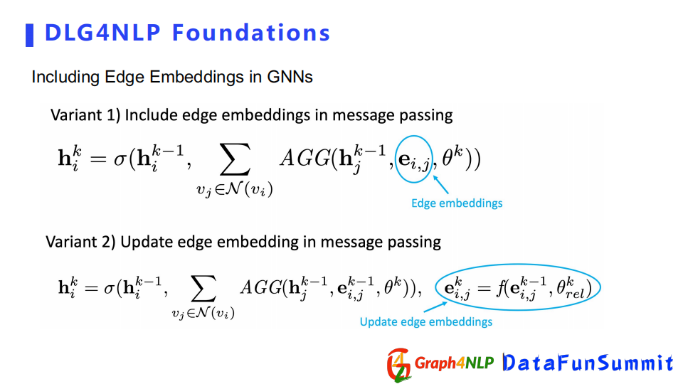 第二种直接引入边的表征向量,其核心是在做message传播时,把边的表征向量加进来可以捕捉不同边的种类。引入边表征向量有两种方式,一种是边表征向量从头到尾是固定不变的,另外一种是边的表征向量像节点一样,在传播中不断地更新迭代。