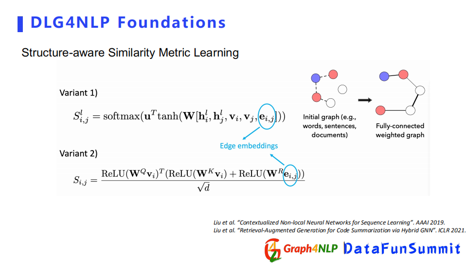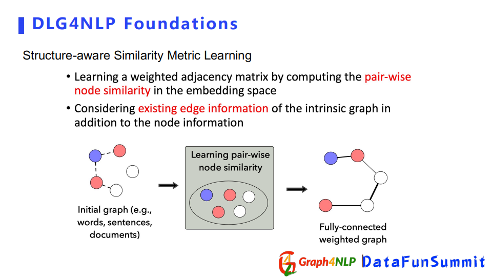在计算相似度时有时不仅要考虑node embedding,还要考虑图本身的结构。可以用structure-aware相似矩阵来学习本身的初始结构,但该结构不确定对下游任务的影响,但是可以先用起来,然后去算structure-aware相似度。
