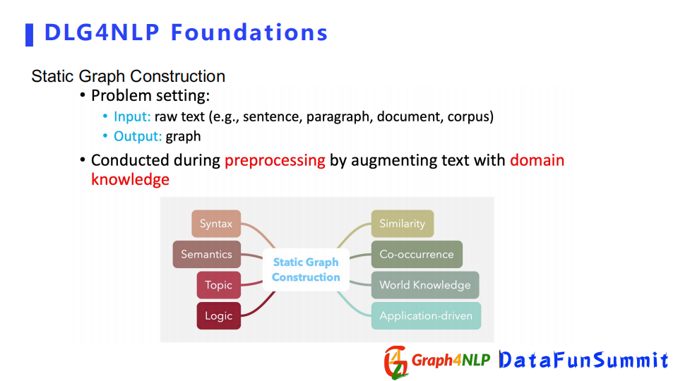 静态图构造的输入可以为原始的句子、段落或者文档,输出是我们针对输入所构造出的图结构。静态图可以在预处理阶段完成,但是它需要有一些对句子或文档文本的领域信息,比如一些语法信息、语义信息、逻辑信息和主题信息,根据领域信息对句子或者文本构造一个图。