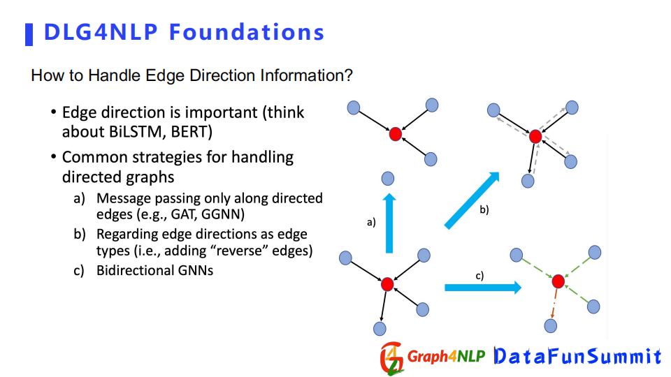 还有一个比较关键的问题,在构图中会经常遇到连接的边具有方向性。边的方向性在表示两个节点关系上是非常重要的。比如说在处理序列时,BiLSTM结构之所以效果很好,其实也是考虑到这种方向性,所以在图结构上也要考虑这个方向性。目前处理方向有三个选择:
