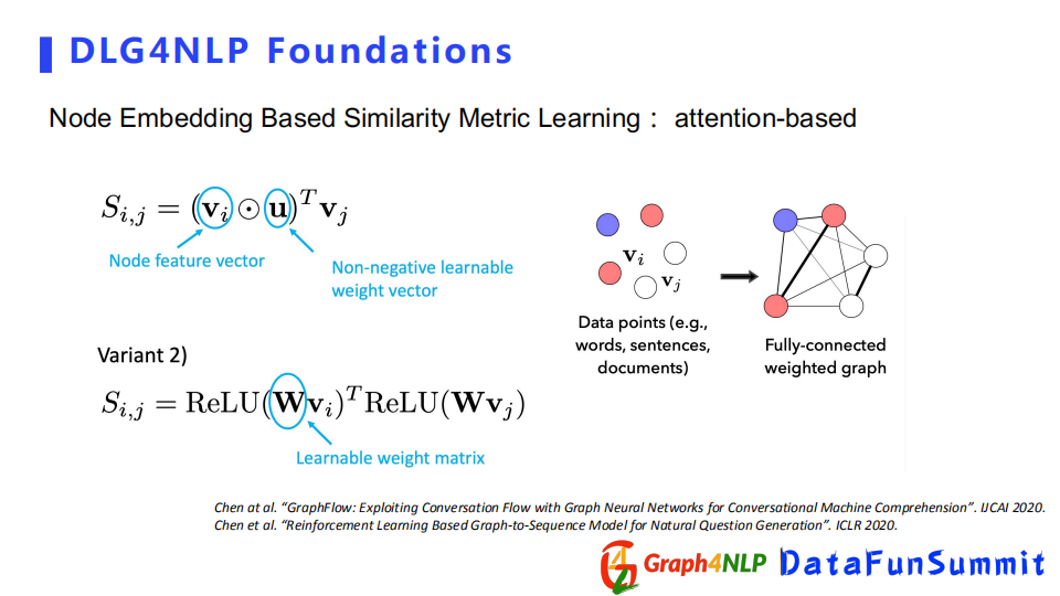 例如有若干个表示为word或者句子的未知关系节点,首先通过图相似矩阵学习的方式去构造一个全连接图,然后对其做稀疏化操作得到稀疏图,然后进行图表征学习。