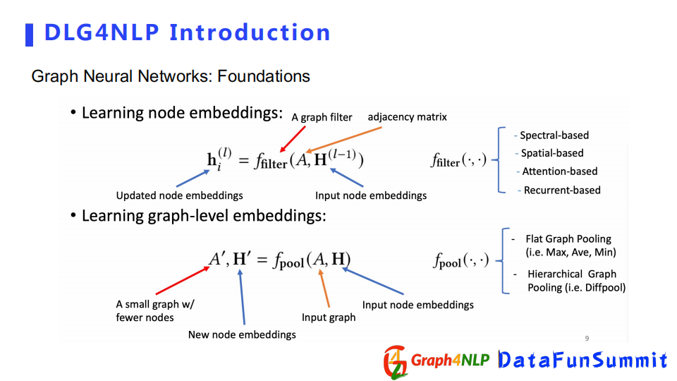 第一个公式为图卷积运算,它的输入为A邻接矩阵和H node embedding(节点表征);对于节点分类和邻接预测的任务,得到节点的表征向量即可。对于图分类和图的生成任务,需要采用pooling(池化操作)对整个图做表征向量,常见的方法有Flat Graph Pooling(求平均、最大、最小值pooling方式);另外一种是Hierarchical Graph Pooling(Diff pool方式),根据图结构把整个node embedding聚合到一起组成一个graph embedding network。