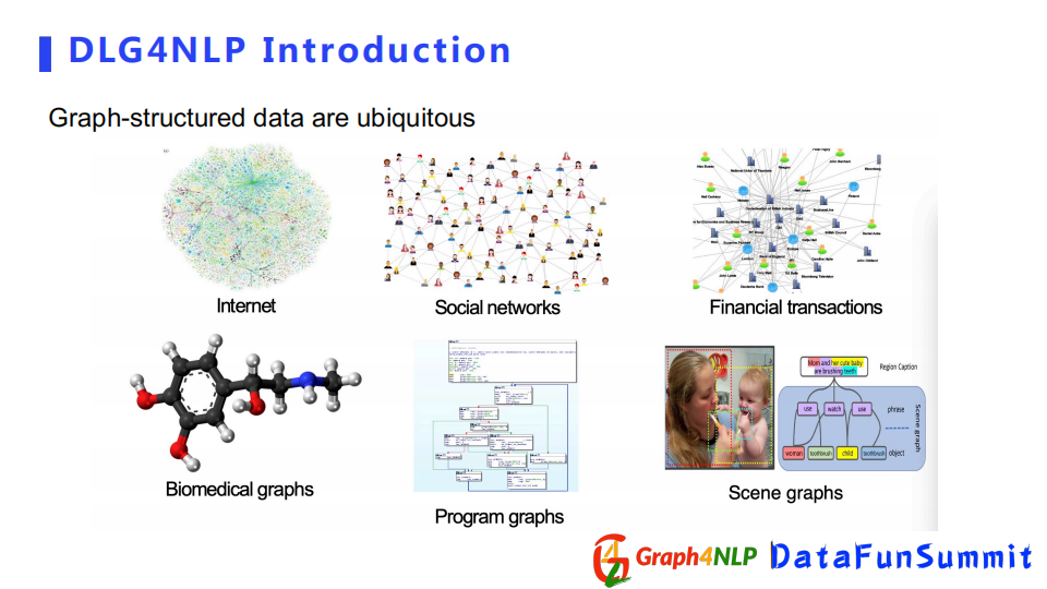 我们知道图结构数据是由节点和边组成的数据类型,在生活的方方面面都可以看到,尤其在大数据时代,比如互联网、社交网络、金融的交易网。还有可以表示成图结构的蛋白质等化学物质。我们也可以用图结构来表示逻辑关系的程序脚本。从图像领域来看,有表示图像里物体间相互交互关系的图结构。