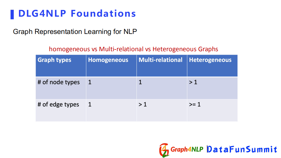 图表征学习分为三种,为Homogeneous Graph、Multi-relational Graph和Heterogenous graph。Homogeneous Graph只有一种节点类型以及一种边类型。Multi-relational Graph是一种节点类型以及多种边类型。Heterogenousgraph则是多种节点类型和多种边类型。