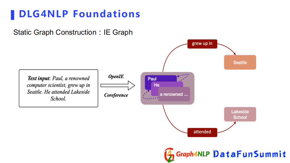 其次介绍AMR Graph和IE Graph,它们都是用来捕捉句子的语义信息,更注重两个词之间语义关系。比如IE Graph例子里面Paul是个人名,然后Seattle是个地名,所以我们首先需要表示它们俩属于实体,同时也需要知道两个实体之间的关系是一种grew up in的语义关系。根据实体关系,可以构造出IE Graph作为最终的构图。