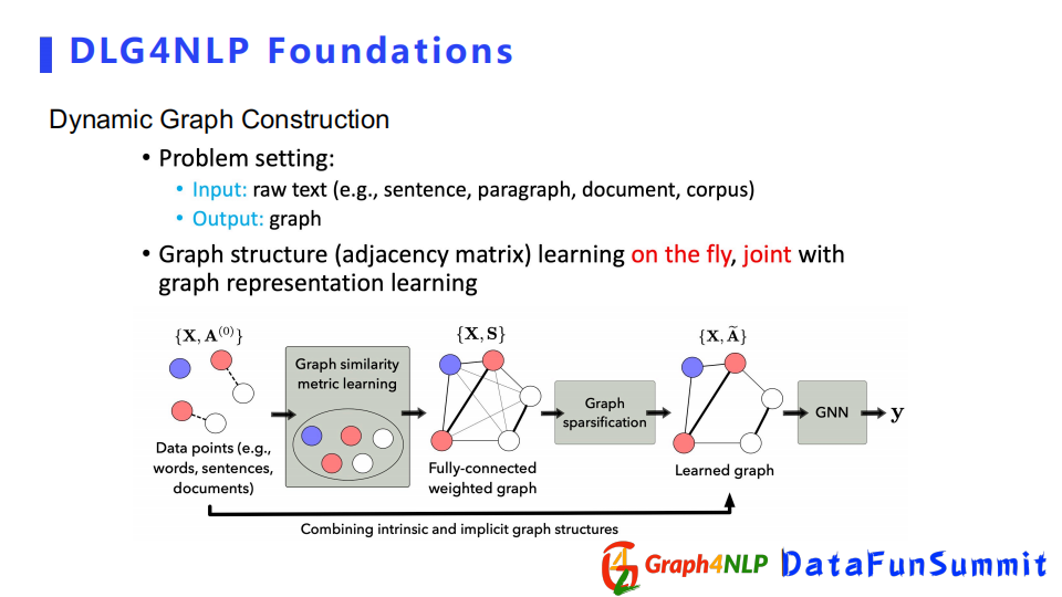 下面介绍另外一种构图方式即动态构图,动态图构造不需要有额外的领域知识去指导如何构图。该方法直接把文本丢给机器,让机器自己去学习图结构。