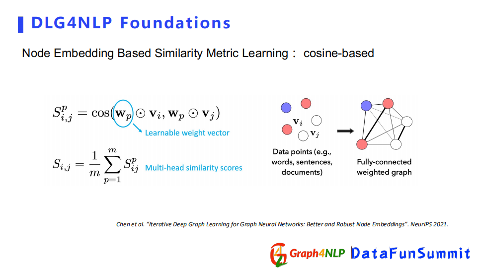 Cosine-based方法是先把节点的表征向量都乘以一个可学习的参数矩阵,相当于将其投影到另一个新的空间,再计算新空间下两个表征向量之间的cosine值。如果想让函数更加具有张力,可以借鉴多头机制(multi-head)设置多个投影空间,即学多个参数。对于每一个头参数都会有一个cosine值,然后把所有的cosine求平均,即为最终的cosine值。